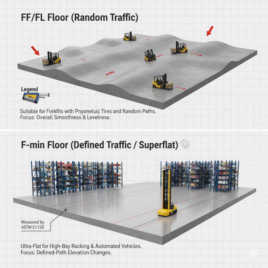 F-min ensures the aisle floor is smooth enough for forklifts to travel safely at their designed speeds.